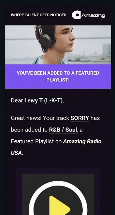 "SORRY" was added to R&B/SOUL a Featured Playlist on Amazing Radio USA